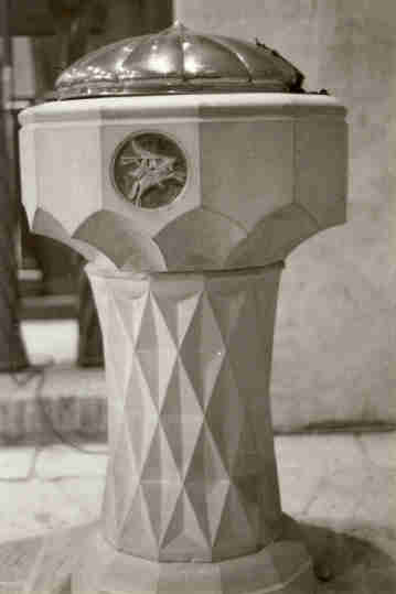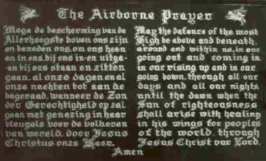 Links het doopvont, rechts het wandbord met het Airborne gebed
