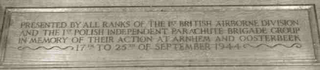 De inscriptie in het blad van de liturgische tafel geeft uitdrukking aan het de herinnering van de veteranen aan de strijd die zij in Arnhem en Oosterbeek leverden