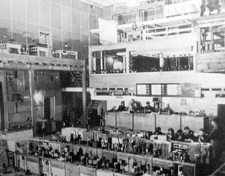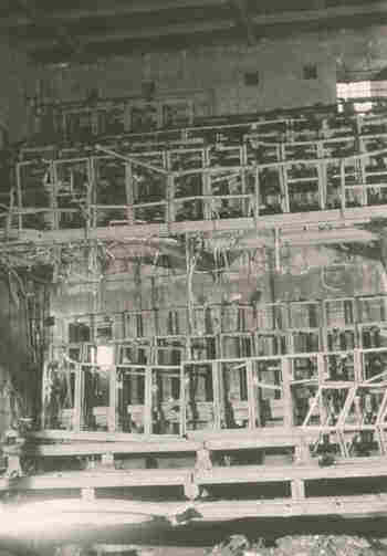 Tot eind jaren zestig is het vernielde interieur in de grote zaal onaangeroerd gebleven; hier de tribunes waar vanaf de Helferinnen op de achterzijde van de matglazen kaart de posities van de vijandelijke vliegtuigen projecteerden