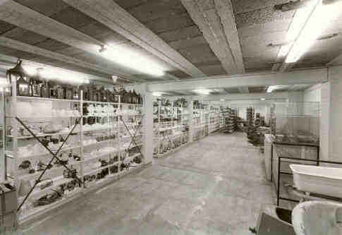 Op wat eens de begane grond was van de grote zaal, staan nu allerlei grote voorwerpen en stellingen vol met kleine, behorend tot de collectie van het Nederlands Openluchtmuseum in Arnhem