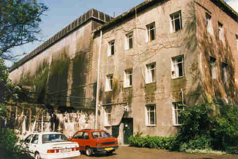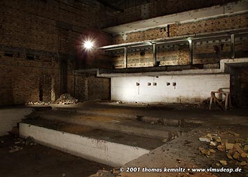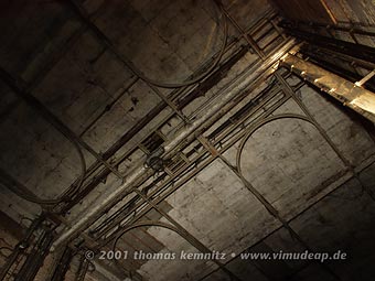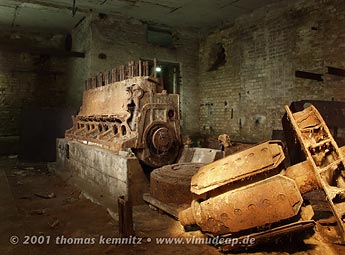 Links: de romp van de dieselmotor met rechts het restant van het anker van de dynamo. Het gewikkelde koperdraad is verdwenen. Rechts: een gedeelte van het framewerk waarin de grote glazen kaart was opgehangen (Foto's: © 2001 Thomas Kemnitz, Virtual Museum of Dead Places)