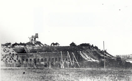 De trieste resten van het uitgebrande paviljoen van Sanatorium Koningsheide, gehuld in wat er nog over is van het camouflagegaas