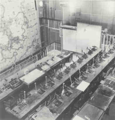 Maar nu even terug naar het hart van Diogenes, de grote zaal. Deze zaal werd gedomineerd door een grote matglazen kaart (9 m hoog, 12 m breed), die verticaal was opgesteld en de ruimte in tweeën deelde. Op de kaart was het operatiegebied van de divisie aangegeven met daarin de plaats van de vliegvelden, radarstations, radiopeilstations e.d. Het operatiegebied bestond globaal uit ons land, de noordelijke helft van België, het Ruhrgebied en een strook Duitsland langs onze oostgrens. Het was de 'drukste' sector van de Duitse luchtverdediging. Aan weerszijden van de kaart waren panelen opgesteld, waarop allerhande aanvullende informatie was vermeld. Achter de kaart waren amfitheatersgewijs zitplaatsen voor ca. 40 zogenoemde Luftnachrichtenhelferinnen (vrouwelijk personeel van de verbindingsdienst van de Luftwaffe; in de volksmond 'grijze muizen', maar door de Duitsers als Blitzmädel aangeduid) gebouwd. Aan de voorzijde van de kaart zaten de divisiecommandant en zijn uitgebreide staf, verdeeld over enkele balkons. Wat er gebeurde en hoe dat gebeurde, daarover later meer.