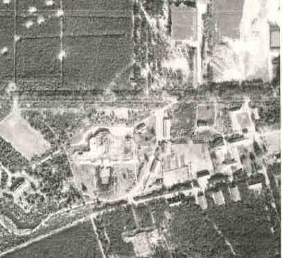 Een sterke uitvergroting van een uitsnede uit een luchtfoto van vliegveld Deelen, die een Brits verkenningsvliegtuig op 2.07.1942 maakte. Het hoofdgebouw van de psychiatrische inrichting is grotendeels aan het oog onttrokken door camouflagegaas dat er overheen is gespannen. Aan de benedenrand van de foto, in de bosrand gelegen, is het proefcommandocentrum reeds te zien