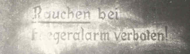 Deze waarschuwing kwam op veel plaatsen in Diogenes op de wanden voor. Helaas zijn dergelijke opschriften bij de grote opknapbeurt van Diogenes alle verdwenen. Let op de zwarte aanslag op de wit geweest zijnde muur; die is ontstaan door de brand die heeft gewoed in het inwendige van Diogenes na de ontploffing in de vooravond van 17 september 1944