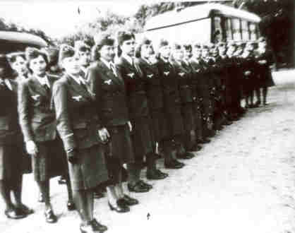 Links het zogenoemde pensionaat Sacré Coeur aan de Velperweg in Arnhem, een van de locaties waar de Helferinnen van Diogenes waren ondergebracht. Rechts: een Ablösung (tegenwoordig zouden we zeggen shift) Luftnachrichtenhelferinnen staat aangetreden bij Sacré Coeur om met bussen naar hun werk in het commandocentrum te worden gebracht