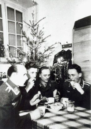Links een kamer in de barak in de kersttijd van 1943, rechts op de achtergrond de barak die na de oorlog de naam "Trekkerslust" kreeg (15 januari 1944)