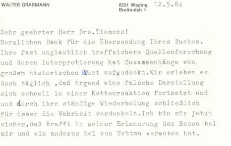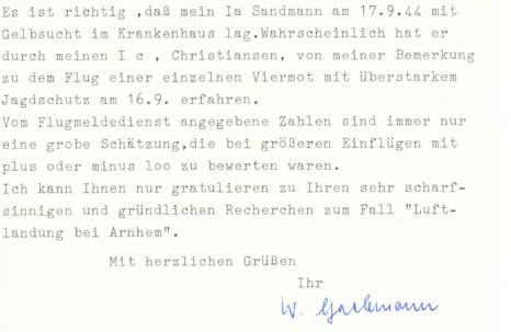 Wanneer deze melding betrekking heeft op deze vlucht, dan zou dat kunnen betekenen, dat de B-17, die tot de befaamde 100-Group behoorde, een eenheid die zich bezig hield met elektronische oorlogvoering (zoals het storen van Duitse radioverbindingen en radarapparatuur), berichten van radioapparatuur met een gering bereik heeft opgepikt en doorgezonden naar Engeland. Berichten van de zogenoemde Jedburgh teams bijvoorbeeld, kleine commando-eenheden, die enkele dagen voor de luchtlandingen actief waren in het gebied en die waren uitgerust met walkie-talkies. Dit zou tevens een goede verklaring zijn voor het van tijd tot tijd cirkelen van de B-17; dat zou immers nodig zijn geweest om binnen het bereik van de zwakke zenders te blijven. Hoewel de namen van alle bemanningsleden van de B-17 bekend zijn, is het mij ook niet gelukt met één van hen in contact te komen. Het heeft er de schijn van, dat de Britten zich lelijk door de vakman Grabmann in de kaart hadden laten kijken. Zij moeten zich dat pijnlijk hebben gerealiseed, toen Grabmann hun verhaal tijdens een van de vele verhoren die hij in zijn bijna driejarige krijgsgevangenschap vertelde.
