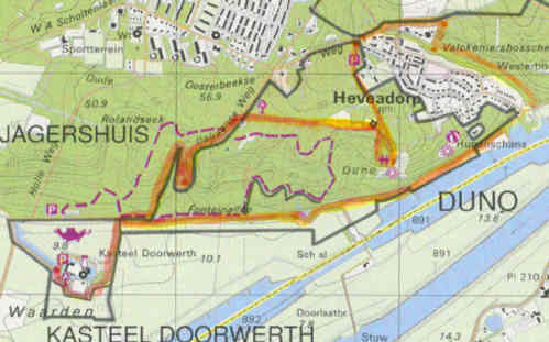 Er vanuit gaande, dat het kopje koffie ons goed gesmaakt heeft en de krachten zijn weergekeerd, maken wij ons op voor de terugtocht naar het kasteel. Vanaf De Valkenier lopen we nog wat verder de Oude Oosterbeekseweg op, passeren een klein nieuwbouwwijkje (rechts) en gaan na het laatste huis rechts het bos in. Het bospad blijven we volgen. Weldra zien we, dat rechts beneden ons de Seelbeek onze metgezel wordt. Door het bosschage achter de Seelbeek vangen we her en der een glimp op van Heveadorp, genoemd naar de Heveafabriek die hier eens stond. Het bewijs daarvan vinden we nog, als we wat verder doorgelopen zijn, aan de rechterzijde van het pad; betonvoeten van inmiddels weggeroeste afrasteringpalen, waarin met sierlijke letters Hevea staat.