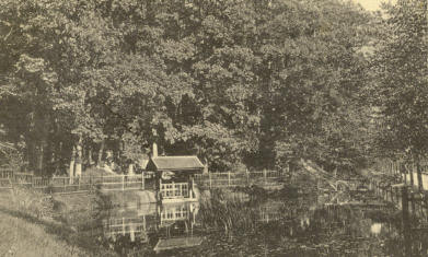 Foto links: op de hoek van de Fonteinallee en de Italiaanseweg lag Het Jagershuis, een houten huis dat aan het einde van de oorlog door krijgshandelingen is verwoest. Foto rechts: voor het huis lag de vijver met boothuisje, hier gezien vanaf de Italiaanseweg. Geheel rechts is nog juist een stukje van de Fonteinallee te zien. Nu is de verwaarloosde vijver nog het enige dat over is van hetgeen deze oude foto's van dit idyllische plekje laten zien