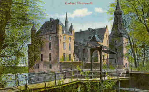 We volgen de Fonteinallee westwaarts. We lopen nu op de scheidslijn tussen twee totaal verschillende landschappen. Links het lage land, het uiterwaardengebied van de Neder Rijn, rechts de gelobde stuwwal uit de ijstijd, een 30 à 40 meter steil opgaand. Na een heerlijke wandeling over dit rustige, absoluut vlakke stukje weg ontwaren we tot onze geruststelling de torentjes van het kasteel boven de bomen. Nu redden we ons verder wel zonder routebeschrijving . . .
