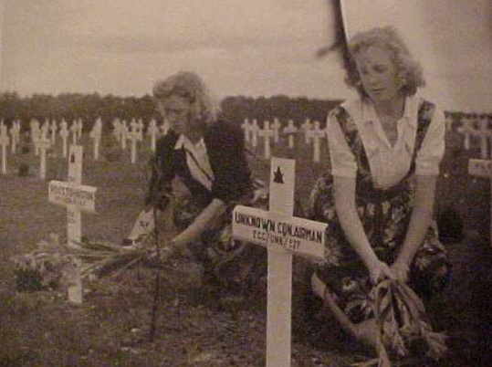 Left: shortly after the war two local girls lay flowers on the graves of two crew members at Canadian War Cemetery, Groesbeek. Right: six graves together; Gerald Quinn's grave got another location - not known is why