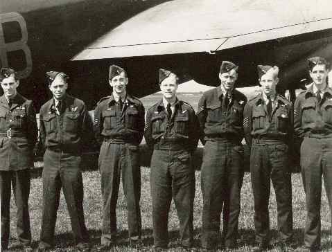 The crew of Lancaster VR - V, left to right: Donald Morissen, Arnold Hupman, Gerald Quinn, Harold Fletcher, Clifford Johnston, Philip McManus and Edward Fahy