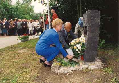 Harold Fletcher's sister Vera and brother Joseph lay flowers near the monument on the place where the Lancaster crashed 50 years before. The monument was unveiled by the burgomaster of Arnhem to which the area belongs now and the burgomaster of Elst, which is the municipality Elden belonged to in 1944