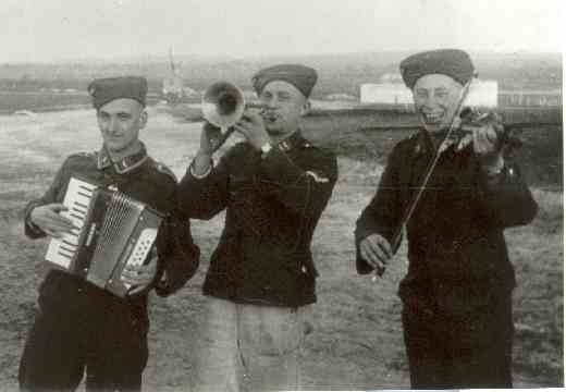 Drie vrolijke muzikanten, met viool Eberhardt Carstensen. Rechts Hannes Beste