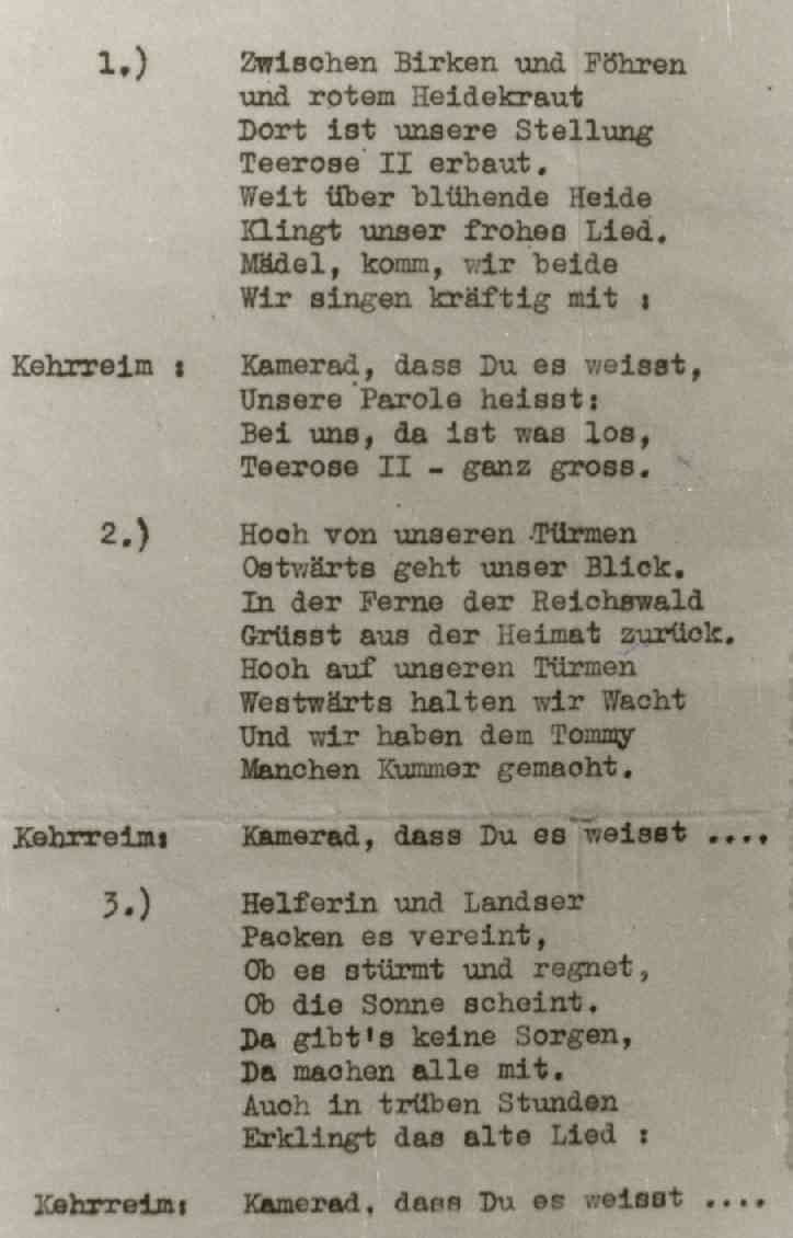 In de tijd waarin Groenewold deze aardige tekst schreef, woedde de oorlog zo ongeveer op zijn hevigst. In dat licht gezien is het lied weinig oorlogszuchtig van toon. Een goede afspiegeling van de geest die er in de beide Teerose stations in die dagen heerste, komt mij voor. Een sfeer die ik trouwens ook proef in historische terugblik op rijm, die Manfred Trowe in het voorjaar van 1987 met veel verve en onder grote instemming tijdens het Teerose-Treffen in Kiel voordroeg. Een aantrekkelijke vorm van geschiedschrijving zoals die niet dikwijls zal voorkomen!