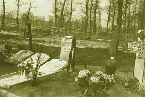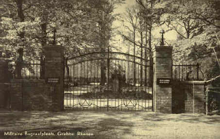 De toegang tot de militaire begraafplaats. Gezien het centraal achter het hek opgestelde gedenkteken (met hakenkruis!) voor de gesneuvelde Duitse militairen, moet deze foto nog tijdens of anders zeer kort na de oorlog zijn gemaakt