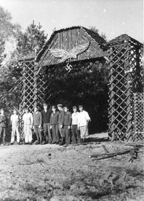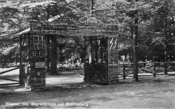 Links de provisorische poort van rondhout, die aanvankelijk de toegang markeerde tot de 'Militaire Begraafplaats op de Grebbeberg'. Op de linker paal stonden de letters RI en het cijfer 8 (8e Regiment Infanterie, de infanterie-eenheid die de Grebbestelling verdedigde), op de rechter paal staan het SS-teken, in de top een groot hakenkruis. Het was kennelijk een bouwwijze van poorten, die bij de Duitsers in trek was, want ook het radiopeilstation Teerose II ten noorden van Velp, had een dergelijk bouwsel (foto rechts)