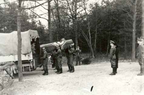 De kist met Oskar Himmel wordt bij Ehrenfriedhof Zypendaal voorzichtig uit de vrachtwagen geladen