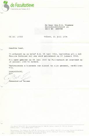 Indien Pauline Hofbauer was gecremeerd, dan was dat waarschijnlijk niet in Duitsland gebeurd, zo overwoog ik. Het lag immers niet voor de hand dat de urn in dat geval weer terug zou zijn gekomen in Teerose. Ik moest maar eens bij het crematorium in Driehuis (toentertijd het enige in ons land) aankloppen.