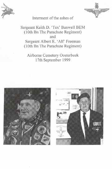 Op 25 juli 1999 overleed Sergeant Keith D. ‘Tex’ Banwell, 80 jaar oud. Samen met die van Sergeant Albert E. ‘Alf’ Freeman werd zijn urn op 17 september 1999 in een sobere plechtigheid in aanwezigheid van zijn vrouw Anne, verdere familie, vrienden en kennissen op het Airborne Kerkhof in Oosterbeek begraven. Zijn vrouw Anne overleed het jaar daarop.