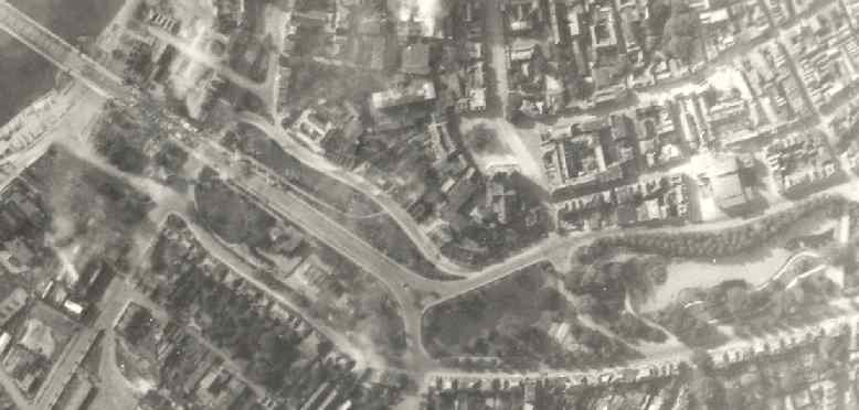 Het strijdgebied waar deze geschiedenis zich afspeelde. In het midden is het kruisvormige dak van de St. Walburgis Basiliek te zien. Deze verkenningsfoto werd op 19 september 1944 omstreeks het middaguur gemaakt, dus kort voordat de jager een van de twee torens van de kerk raakte. De rook van diverse branden maakt duidelijk, dat er rond de oprit van de brug hard werd gevochten