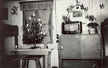 Kamertje in een houten barak die in Unterkunft West in Brielle stond. Achterop de foto stond: Weihnachten 1943