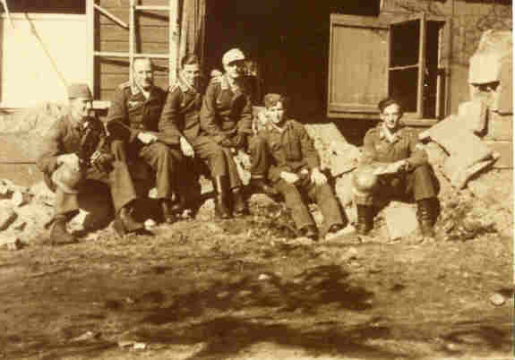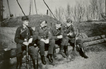 Vier Duitsers, waarvan twee met hun wapen, zittend op een boomstam voor Unterkunft West in Brielle. Tweede van rechts Gefreiter Werner Müller. Achterop de foto stond: Ruhepause vor der Unterkunft West