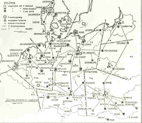 De situering van de radiopeilstations in de diverse divisiesectoren, waarin het Duitse luchtverdedigingsstelsel in Europa begin 1945 was verdeeld. In ons land functioneerde toen alleen Teerose II nog