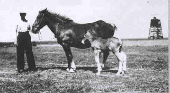 Mei 1945, de heer R.v.d. Berg poseert trots met zijn merrie en veulen - een rijk bezit zo direct na de oorlog - voor de foto. Op de achtergrond de meest noordelijke peiltoren van Löwenzahn