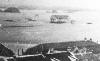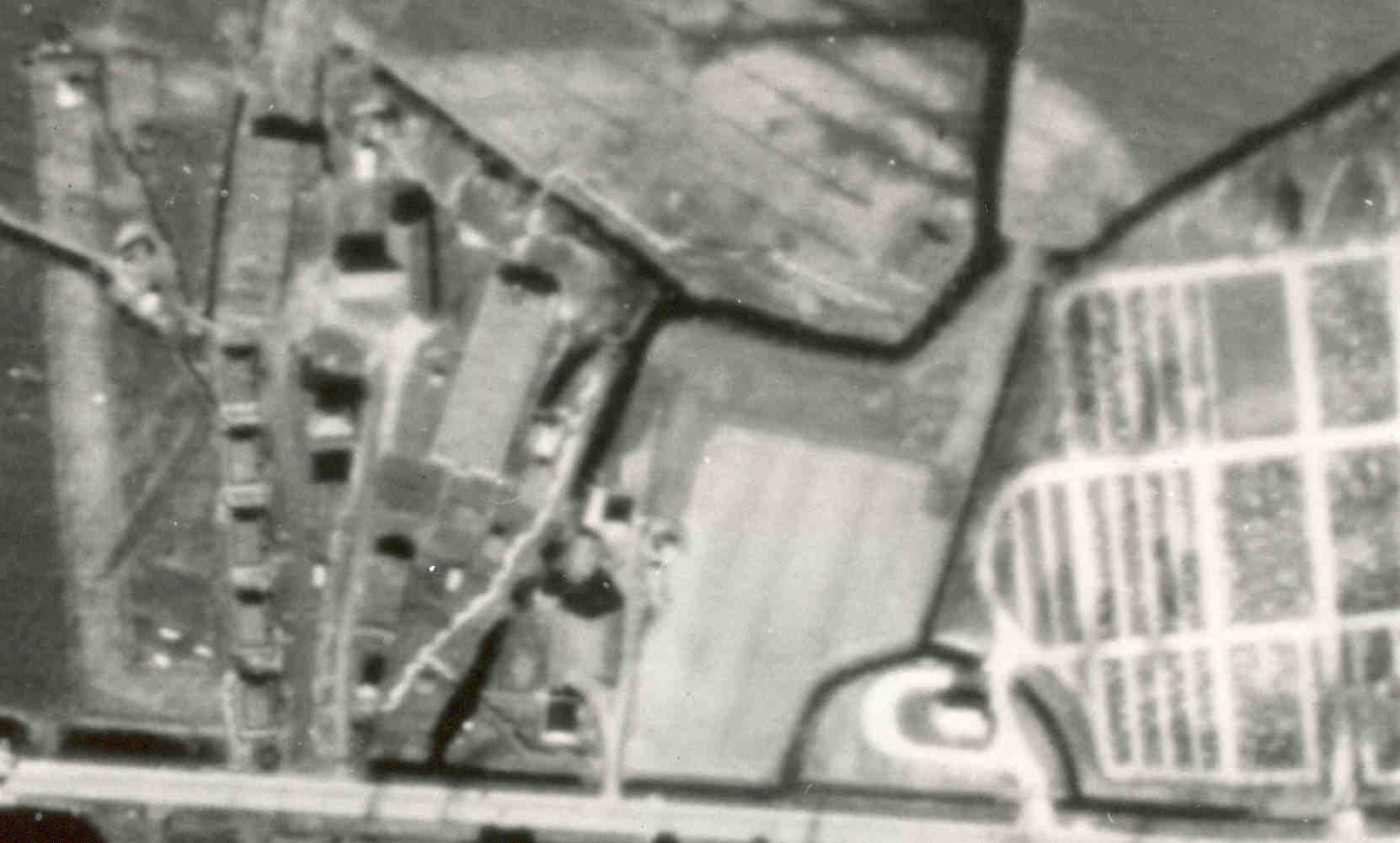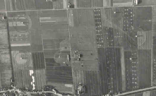 Schneeglöckchen in de polder De Keins bij Schagen. In het midden de T-vormige Auswertung met rechts daaraan vastgebouwde barakken. De slagschaduw links boven verraadt een van de vijf torens van het station (26.02.1945)