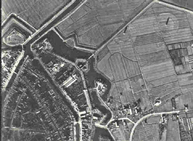 Het radiopeilstation Löwenzahn aan de westzijde van Franeker. Rechts de begraafplaats, waar Löwenzahn aan grensde. De Auswertung in het midden van de stelling is duidelijk herkenbaar. Het gebouw bestaat nog steeds en is in gebruik bij de gemeente
