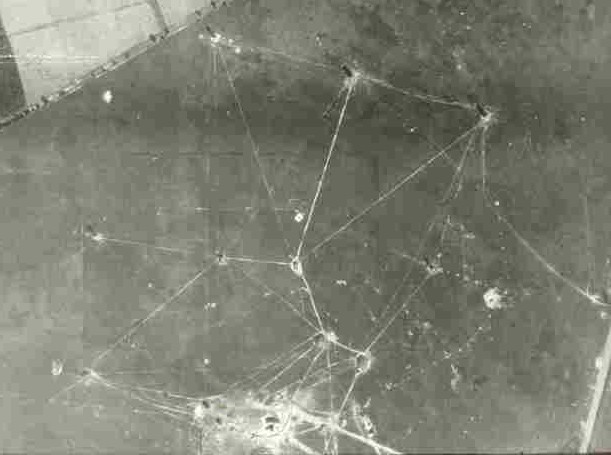 De paadjes door de heide naar de torens en de zenderhuisjes vormen een opvallend web. Onderaan de T-vormige Auswertung, in de rechter benedenhoek een stukje van de Apeldoornseweg zichtbaar