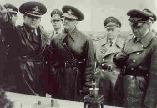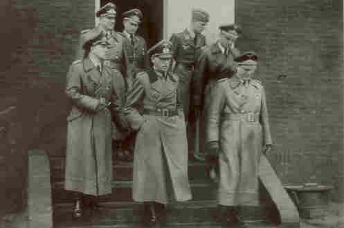 Links: generaal Josef Kammhuber verlaat de Auswertung van Teerose I, rechts: ook de bekende generaal Adolf Galland komt een kijkje nemen