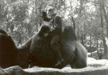 Heinz Schmidt op een kameel in Burgers' Dierenpark in Arnhem