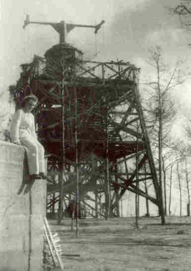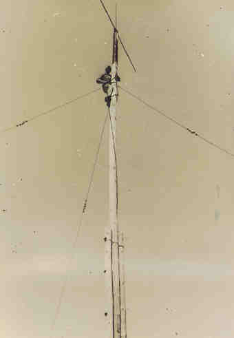 Onderhoud aan een van de zendantennes van Teerose II, gemonteerd op een hoge houten mast