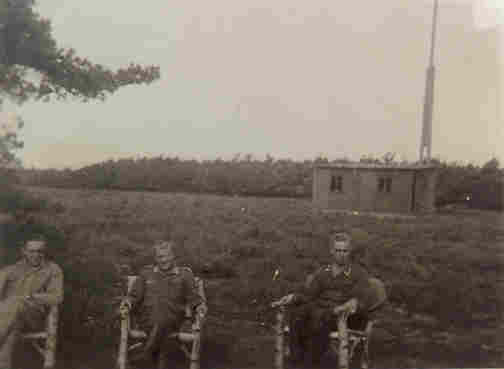 Personeel van Teerose III, zittend in zelfgemaakte stoel van berkenstammetjes; op de achtergrond een zenderhuisje en -mast