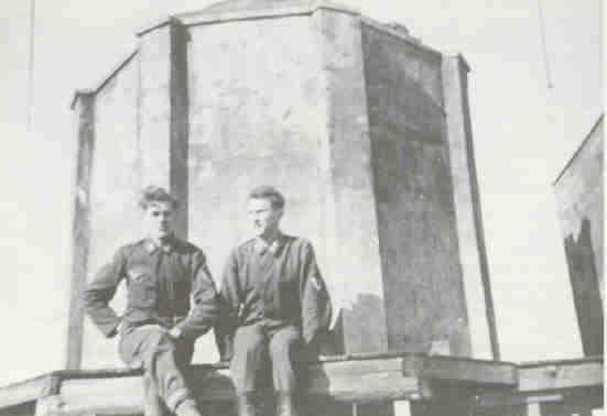 Gefreiter Werner Müller (r) voor het peilhutje op de toren van de Brielse Dom